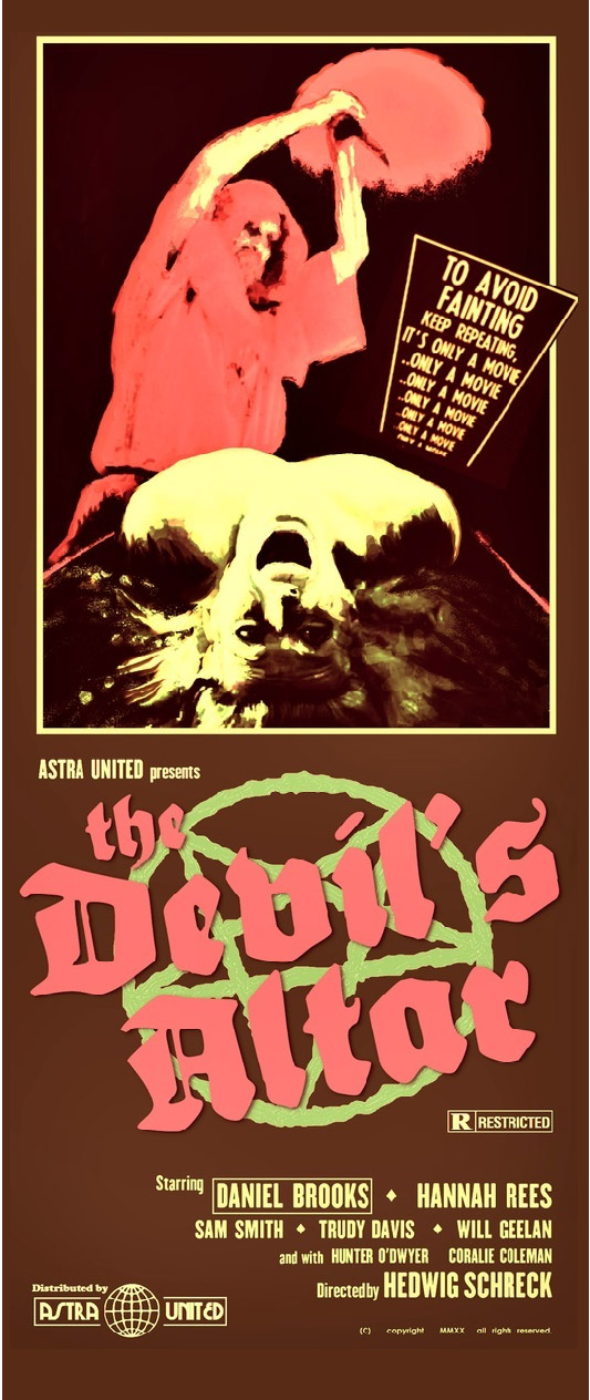 THE DEVIL’S ALTAR was filmed on a very small budget – Andy Milligan small (as are all of our films). It was our second film after DELIRIUM 13 so we were excited to keep going forward. The film began originally as a Super 8 film production, however this was abandoned after we lost three cameras to sand and grit getting into the mechanics whilst filming beach scenes of the cult. We decided to just finish the film digitally and play with the ‘look’ in the editor. It was a very fun experience with great people. Everyone gave their all.