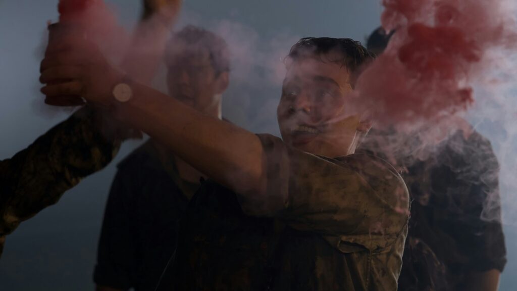 Yet for all its strengths, the film falters in originality. The early barracks scenes lean on tired clichés, like Des’s one-note racism to make him a one-note bad guy. The shark attacks, while effectively staged, rarely push beyond what audiences have seen before, and the absence of underwater sequences makes it feel visually conservative compared to films like 47 Meters Down. Hints at Leo’s deeper backstory, showing past trauma and knowledge about Great White Sharks, feel shoehorned in to give a character the ability to explain some shark facts to others; the tragedy of not having Shark Week during World War II.
