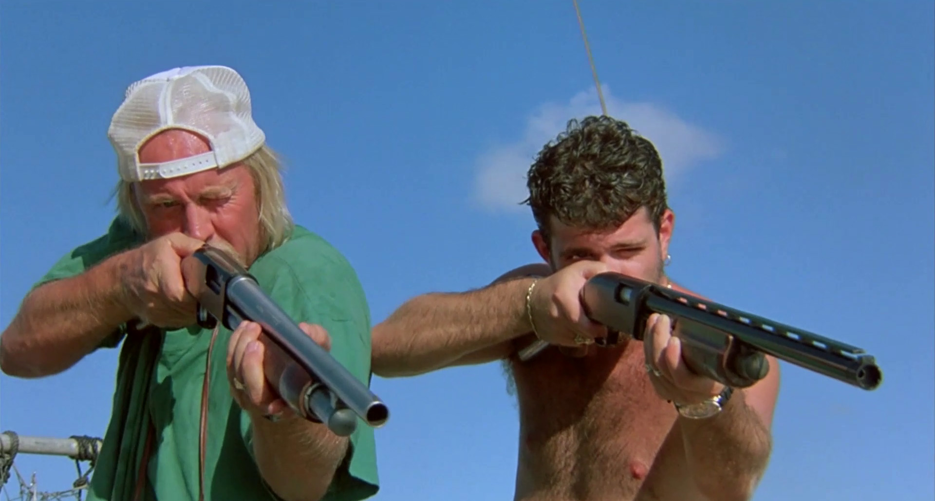 On a mission to protect his business, his town, and his daughter, the not-quite-Hulkster pairs up with a “nerd fish doctor” and the local sheriff to stop the snack-happy shark. It’s only after a false catch and a deadly end to the big windsurfing competition that the mayor starts to care, and Lewis offers up a cash reward. Killing the shark will take every weapon at their disposal, be it shotgun, helicopter, or self-immolation.